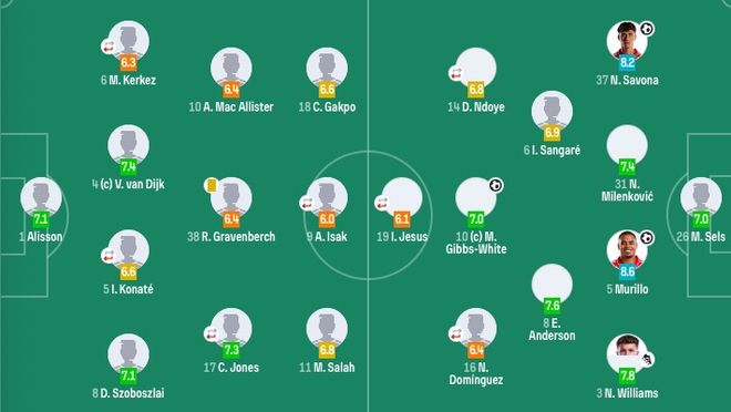 利物浦首发:1-阿利松、8-索博斯洛伊、4-范戴克、5-科纳特(55'22-埃基蒂克)、6-凯尔凯兹(68'26-罗伯逊)、17-琼斯(78'73-恩古莫哈)、38-赫拉芬贝赫、10-麦卡利斯特、11-萨拉赫、9-伊萨克(68'14-基耶萨)、18-加克波